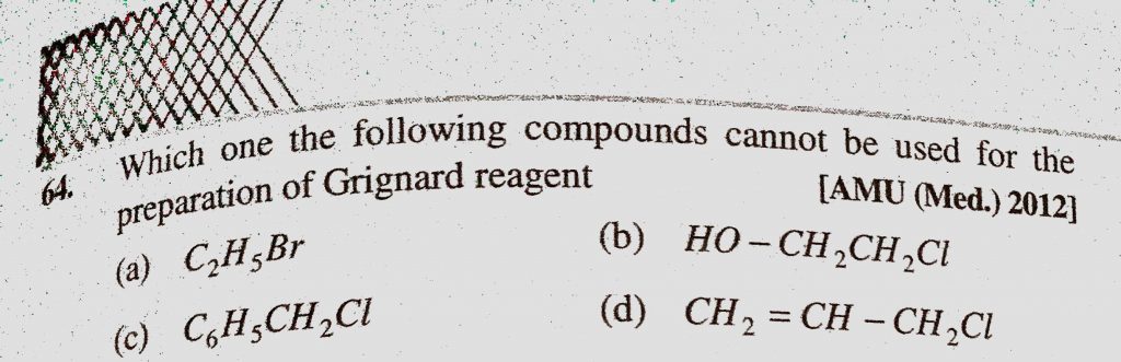 Which one of the following compounds cannot be used for the preparation of Grignard reagent (a) C2H5Br (b) HO – CH2CH2Cl (c) C6H5CH2Cl Which one of the following compounds cannot be used for the preparation of Grignard reagent (a) C2H5Br (b) HO - CH2CH2Cl (c) C6H5CH2Cl February 8, 2021 Category: Uncategorised (JEE Advanced Physics by BM Sharma + GMP Solutions) , Facebook Messenger WhatsApp Share this:TwitterFacebook Related