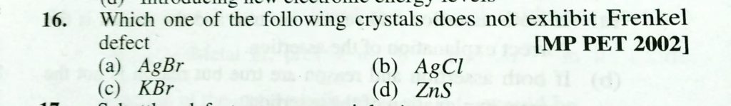 Which one of the following crystals does not exhibit Frenkel defect (a) AgBr (b) AgCl (c) KBr (d) ZnS Which one of the following crystals does not exhibit Frenkel defect (a) AgBr (b) AgCl (c) KBr (d) ZnS February 9, 2021 Category: Uncategorised (JEE Advanced Physics by BM Sharma + GMP Solutions) , Facebook Messenger WhatsApp Share this:TwitterFacebook Related