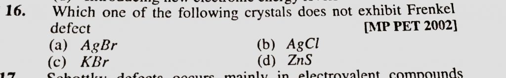 Which one of the following crystals does not exhibiot frenkel defect (a) AgBr (b) AgCl (c) KBr (d) ZnS Which one of the following crystals does not exhibiot frenkel defect (a) AgBr (b) AgCl (c) KBr (d) ZnS December 17, 2020 Category: Uncategorised (JEE Advanced Physics by BM Sharma + GMP Solutions) , Facebook Messenger WhatsApp Share this:TwitterFacebook Related