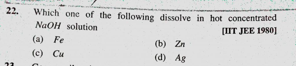 Which one of the following dissolve in hot concentrated NaOH solution (a) Fe (b) Zn (c) Cu (d) Ag Which one of the following dissolve in hot concentrated NaOH solution (a) Fe (b) Zn (c) Cu (d) Ag December 2, 2020 Category: Uncategorised (JEE Advanced Physics by BM Sharma + GMP Solutions) , Facebook Messenger WhatsApp Share this:TwitterFacebook Related