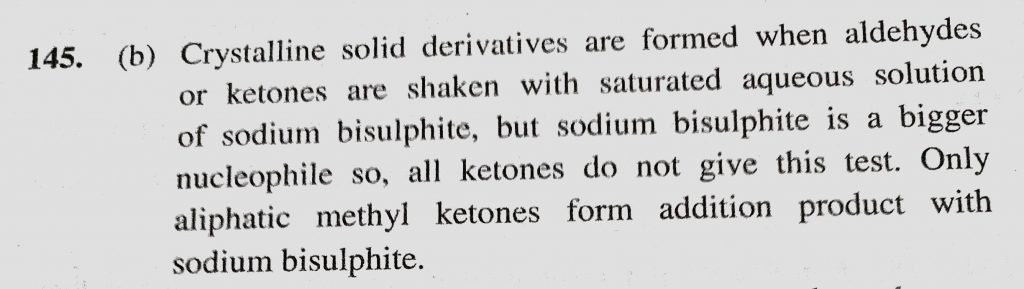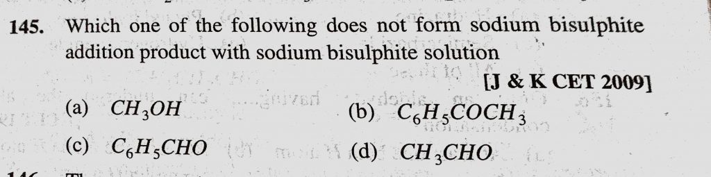 Which one of the following does not form sodium bisulphite addition product with sodium bisulphite solution (a) CH3OH (b) C6H5COCH3 (c) C6H5CHO (d) CH3CHO Which one of the following does not form sodium bisulphite addition product with sodium bisulphite solution (a) CH3OH (b) C6H5COCH3 (c) C6H5CHO (d) CH3CHO February 12, 2021 Category: Uncategorised (JEE Advanced Physics by BM Sharma + GMP Solutions) , Facebook Messenger WhatsApp Share this:TwitterFacebook Related