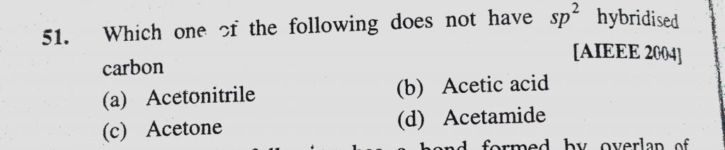 Which one of the following does not have sp2 hybridised carbon (a) Acetonitrile (b) Acetic acid (c) Acetone Which one of the following does not have sp2 hybridised carbon (a) Acetonitrile (b) Acetic acid (c) Acetone December 8, 2020 Category: Uncategorised (JEE Advanced Physics by BM Sharma + GMP Solutions) , Facebook Messenger WhatsApp Share this:TwitterFacebook Related