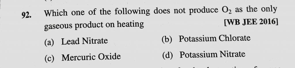 Which one of the following does not produce O2 as the only gaseous product on heating (a) Lead Nitrate (b) Potassium chlorate (c) Mercuric oxide Which one of the following does not produce O2 as the only gaseous product on heating (a) Lead Nitrate (b) Potassium chlorate (c) Mercuric oxide November 23, 2020 Category: Uncategorised (JEE Advanced Physics by BM Sharma + GMP Solutions) , Facebook Messenger WhatsApp Share this:TwitterFacebook Related