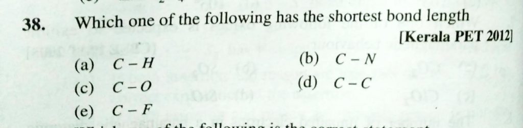 Which one of the following haa the shortest bond length (a) C – H (b) C – N (c) C – O (d) C – C (e) C -F Which one of the following haa the shortest bond length (a) C - H (b) C - N (c) C - O (d) C - C (e) C -F December 8, 2020 Category: Uncategorised (JEE Advanced Physics by BM Sharma + GMP Solutions) , Facebook Messenger WhatsApp Share this:TwitterFacebook Related