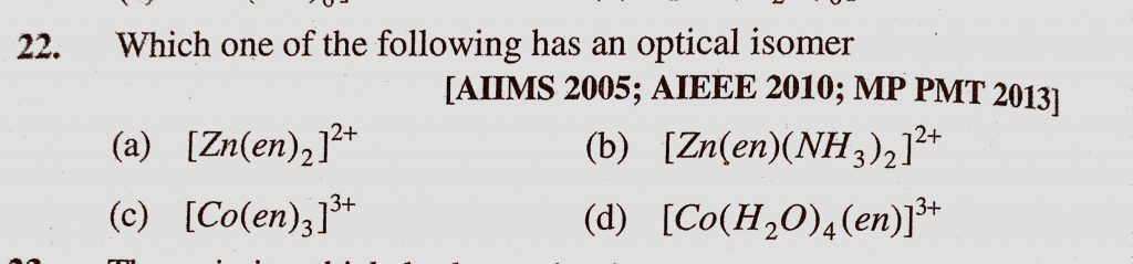 Which one of the following has an optical isomer (a) (Zn(en)2) 2+ (b) (Zn(en)(NH3)2) 2+ (c) (Co(en)3) 3+ Which one of the following has an optical isomer (a) (Zn(en)2) 2+ (b) (Zn(en)(NH3)2) 2+ (c) (Co(en)3) 3+ December 4, 2020 Category: Uncategorised (JEE Advanced Physics by BM Sharma + GMP Solutions) , Facebook Messenger WhatsApp Share this:TwitterFacebook Related