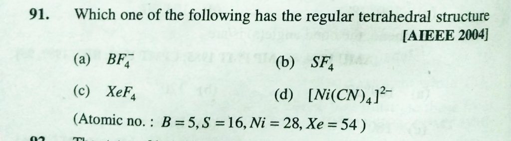 Which one of the following has the regular tetrahedral structure (a) BF4^- (b) SF4 (c0 XeF4 (d) [Ni (CN)4 ]^2- Which one of the following has the regular tetrahedral structure (a) BF4^- (b) SF4 (c0 XeF4 (d) [Ni (CN)4 ]^2- December 6, 2020 Category: Uncategorised (JEE Advanced Physics by BM Sharma + GMP Solutions) , Facebook Messenger WhatsApp Share this:TwitterFacebook Related