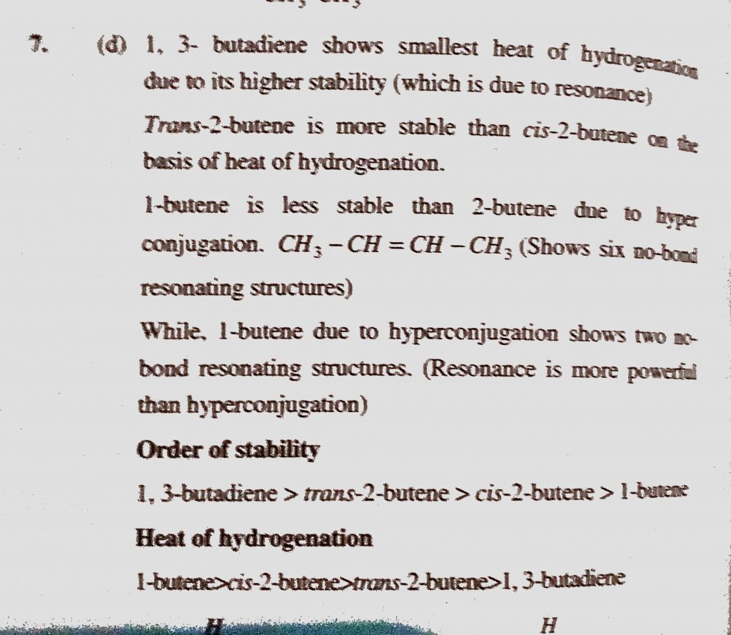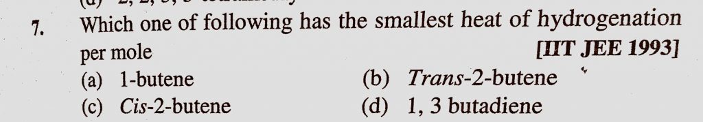 Which one of the following has the smallest heat of hydrogenation per mole (a) 1-butene (b) Trans-2-butene Which one of the following has the smallest heat of hydrogenation per mole (a) 1-butene (b) Trans-2-butene December 12, 2020 Category: Uncategorised (JEE Advanced Physics by BM Sharma + GMP Solutions) , Facebook Messenger WhatsApp Share this:TwitterFacebook Related