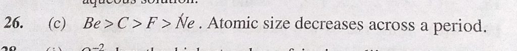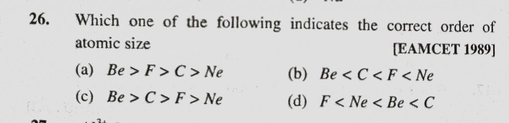 Which one of the following indicates the correct order of atomic size (a) Be > F > C > Ne (b) Be < C < F C > F > Ne (d) F < Ne < Be < C Which one of the following indicates the correct order of atomic size (a) Be > F > C > Ne (b) Be < C < F C > F > Ne (d) F < Ne < Be < C November 9, 2020 Category: Uncategorised (JEE Advanced Physics by BM Sharma + GMP Solutions) , Facebook Messenger WhatsApp Share this:TwitterFacebook Related