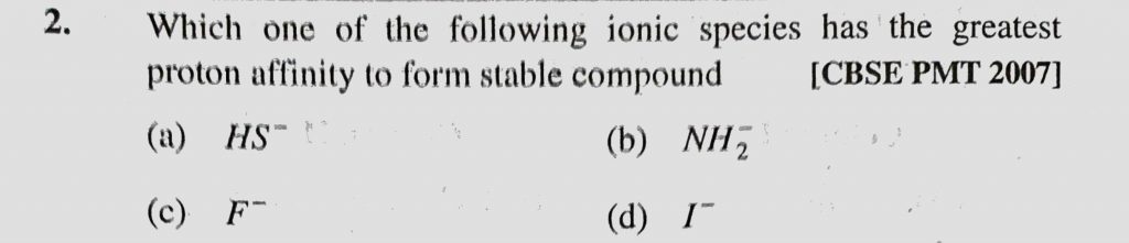 Which one of the following ionic species has the greatest proton affinity to form stable compound Which one of the following ionic species has the greatest proton affinity to form stable compound November 10, 2020 Category: Uncategorised (JEE Advanced Physics by BM Sharma + GMP Solutions) , Facebook Messenger WhatsApp Share this:TwitterFacebook Related