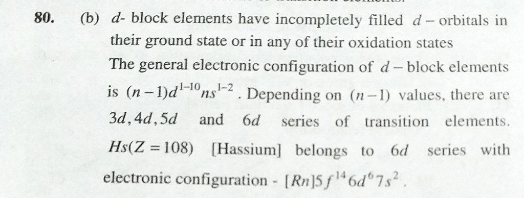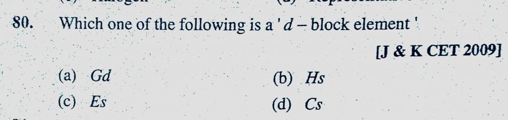 Which one of the following is a ‘d-block element’ (a) Gd (b) Hs (c) Es (d) Cs Which one of the following is a 'd-block element' (a) Gd (b) Hs (c) Es (d) Cs November 9, 2020 Category: Uncategorised (JEE Advanced Physics by BM Sharma + GMP Solutions) , Facebook Messenger WhatsApp Share this:TwitterFacebook Related