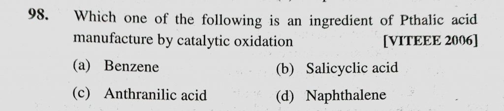 Which one of the following is an ingredient of pthalic acid manufacture by catalytic oxidation (a) Benzene (b) Salicyclic acid (c) Anthranilic acid (d) Naphthalene Which one of the following is an ingredient of pthalic acid manufacture by catalytic oxidation (a) Benzene (b) Salicyclic acid (c) Anthranilic acid (d) Naphthalene February 13, 2021 Category: Uncategorised (JEE Advanced Physics by BM Sharma + GMP Solutions) , Facebook Messenger WhatsApp Share this:TwitterFacebook Related