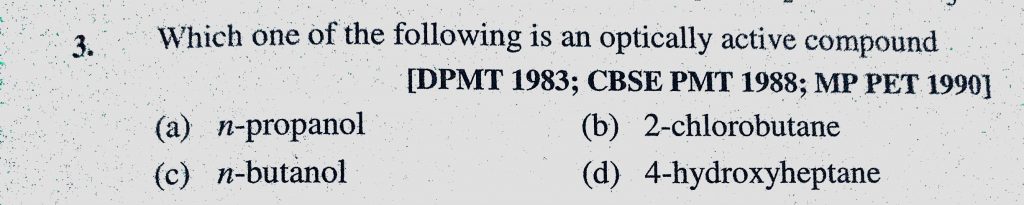Which one of the following is an optically active compound (a) n-propanol (b) 2-chlorobutane (c) n-butanol (d) 4-hydroxyheptane Which one of the following is an optically active compound (a) n-propanol (b) 2-chlorobutane (c) n-butanol (d) 4-hydroxyheptane December 9, 2020 Category: Uncategorised (JEE Advanced Physics by BM Sharma + GMP Solutions) , Facebook Messenger WhatsApp Share this:TwitterFacebook Related