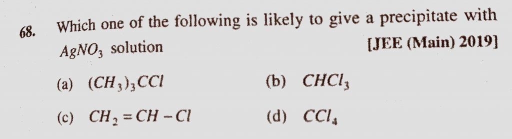 Which one of the following is likely to give a precipitate with AgNO3 solution (a) (CH3)3CCl (b) CHCl3 (c) CH2 = CH – Cl (d) CCl4 Which one of the following is likely to give a precipitate with AgNO3 solution (a) (CH3)3CCl (b) CHCl3 (c) CH2 = CH - Cl (d) CCl4 February 9, 2021 Category: Uncategorised (JEE Advanced Physics by BM Sharma + GMP Solutions) , Facebook Messenger WhatsApp Share this:TwitterFacebook Related