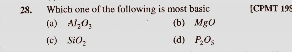 Which one of the following is most basic (a) Al2O3 (b) MgO (c) SiO2 (d) P2O5 Which one of the following is most basic (a) Al2O3 (b) MgO (c) SiO2 (d) P2O5 November 15, 2020 Category: Uncategorised (JEE Advanced Physics by BM Sharma + GMP Solutions) , Facebook Messenger WhatsApp Share this:TwitterFacebook Related