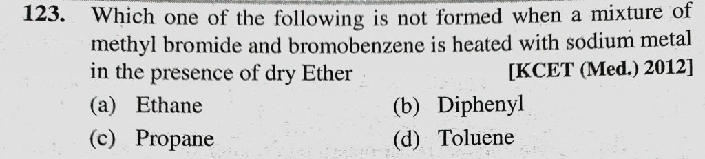 Which one of the following is not formed when a mixture of methyl bromide and bromobenzene is heated with sodium metal in the presence of dry Ether (a) Ethane (b) Diphenyl Which one of the following is not formed when a mixture of methyl bromide and bromobenzene is heated with sodium metal in the presence of dry Ether (a) Ethane (b) Diphenyl February 8, 2021 Category: Uncategorised (JEE Advanced Physics by BM Sharma + GMP Solutions) , Facebook Messenger WhatsApp Share this:TwitterFacebook Related