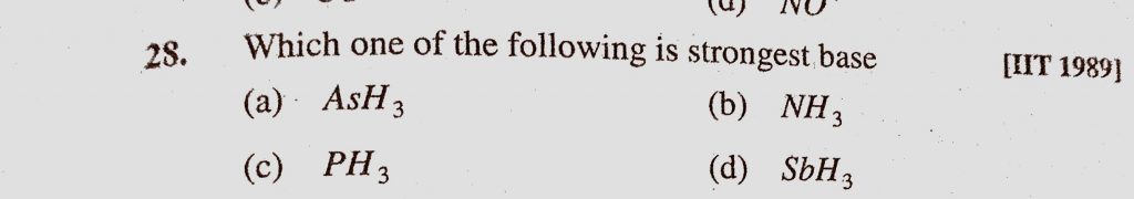 Which one of the following is strongest base (a) AsH3 (b) NH3 (c) PH3 (d) SbH3 Which one of the following is strongest base (a) AsH3 (b) NH3 (c) PH3 (d) SbH3 November 10, 2020 Category: Uncategorised (JEE Advanced Physics by BM Sharma + GMP Solutions) , Facebook Messenger WhatsApp Share this:TwitterFacebook Related