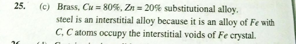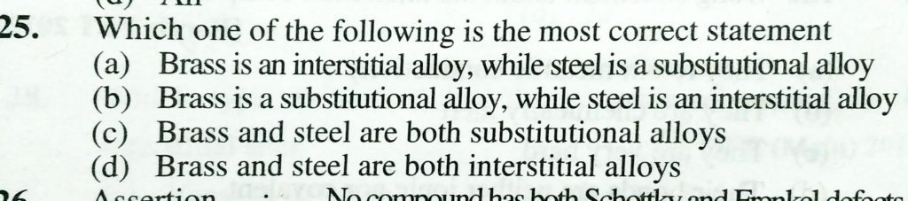 Which one of the following is the most correct statement (a) Brass is an interstitial alloy, while steel is a substitutional alloy (b) Brass is a substitutional alloy , while steel is an interstitial alloy (c) Brass and steel are both substional alloy (d) Brass and steel are both interstitial alloy