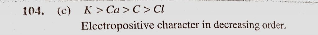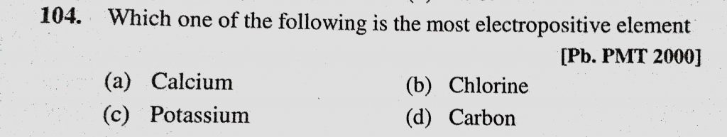 Which one of the following is the most electropositive element (a) Calcium (b) Chlorine (c) Potassium (d) Carbon Which one of the following is the most electropositive element (a) Calcium (b) Chlorine (c) Potassium (d) Carbon November 15, 2020 Category: Uncategorised (JEE Advanced Physics by BM Sharma + GMP Solutions) , Facebook Messenger WhatsApp Share this:TwitterFacebook Related