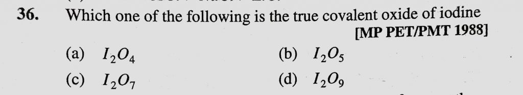 Which one of the following is the true covalent oxide of iodine (a) I2O4 (b) I2O5 (c) I2O7 (d) I2O9 Which one of the following is the true covalent oxide of iodine (a) I2O4 (b) I2O5 (c) I2O7 (d) I2O9 November 27, 2020 Category: Uncategorised (JEE Advanced Physics by BM Sharma + GMP Solutions) , Facebook Messenger WhatsApp Share this:TwitterFacebook Related