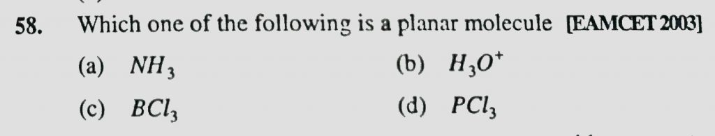Which one of the following is a planar molecule (a) NH3 (b) H3O^+ (c) BCL3 (d) PCL3 Which one of the following is a planar molecule (a) NH3 (b) H3O^+ (c) BCL3 (d) PCL3 December 6, 2020 Category: Uncategorised (JEE Advanced Physics by BM Sharma + GMP Solutions) , Facebook Messenger WhatsApp Share this:TwitterFacebook Related