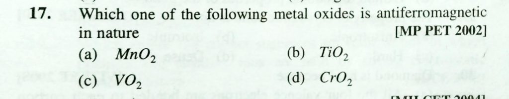 Which one of the following metal oxides is antiferromagnetic in nature (a) MnO2 (b) TiO2 (c) VO2 (d) CrO2 Which one of the following metal oxides is antiferromagnetic in nature (a) MnO2 (b) TiO2 (c) VO2 (d) CrO2 February 8, 2021 Category: Uncategorised (JEE Advanced Physics by BM Sharma + GMP Solutions) , Facebook Messenger WhatsApp Share this:TwitterFacebook Related