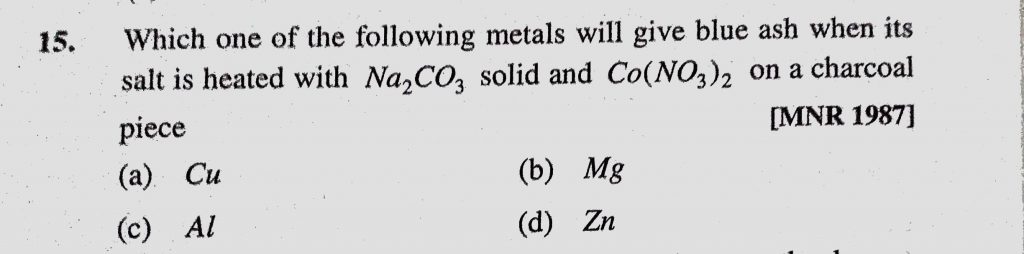 Which one of the following metals will give blue ash when its salt is heated with Na2CO3 solid and Co(NO3)2 on a charcoal piece Which one of the following metals will give blue ash when its salt is heated with Na2CO3 solid and Co(NO3)2 on a charcoal piece December 6, 2020 Category: Uncategorised (JEE Advanced Physics by BM Sharma + GMP Solutions) , Facebook Messenger WhatsApp Share this:TwitterFacebook Related