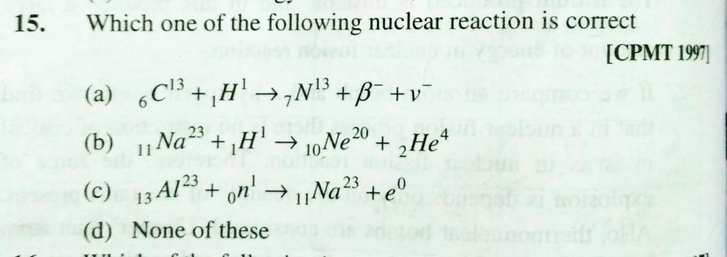 Which one of the following niuclear reaction is correct (a) 6C^13 + 1H^1 gives 7N^13 + bita ^- +v^- (b) 11Na^23 + 1H^1 gives 10Ne^20 +2 He^4 Which one of the following niuclear reaction is correct (a) 6C^13 + 1H^1 gives 7N^13 + bita ^- +v^- (b) 11Na^23 + 1H^1 gives 10Ne^20 +2 He^4 February 13, 2021 Category: Uncategorised (JEE Advanced Physics by BM Sharma + GMP Solutions) , Facebook Messenger WhatsApp Share this:TwitterFacebook Related