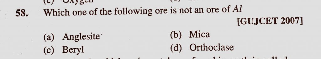Which one of the following ore is not an ore of Al (a) Anglesite (b) Mica (c) Beryl (d) Orthoclase Which one of the following ore is not an ore of Al (a) Anglesite (b) Mica (c) Beryl (d) Orthoclase November 11, 2020 Category: Uncategorised (JEE Advanced Physics by BM Sharma + GMP Solutions) , Facebook Messenger WhatsApp Share this:TwitterFacebook Related