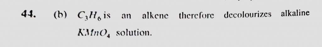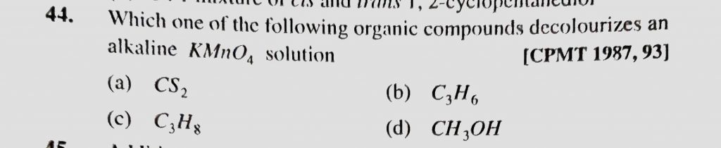 Which one of the following organic compounds decolourizes an alkaline KMnO4 solution (a) CS2 (b) C3H6 (c) C3H8 (d) CH3OH Which one of the following organic compounds decolourizes an alkaline KMnO4 solution (a) CS2 (b) C3H6 (c) C3H8 (d) CH3OH December 13, 2020 Category: Uncategorised (JEE Advanced Physics by BM Sharma + GMP Solutions) , Facebook Messenger WhatsApp Share this:TwitterFacebook Related