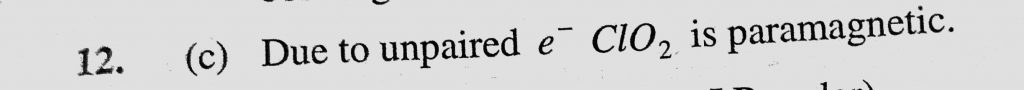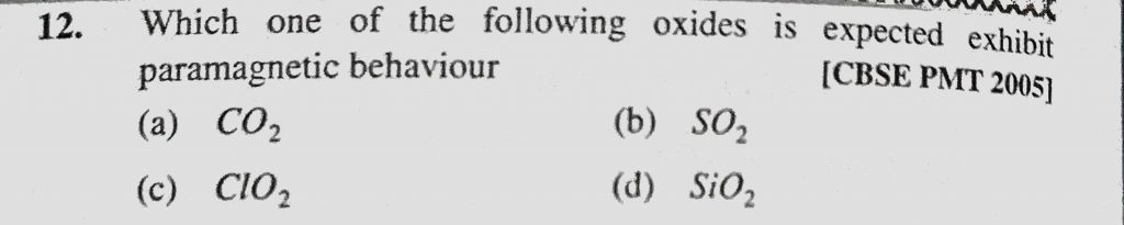 Which one of the following oxides is expected exhibit paramagnetic behaviour (a) CO2 (b) SO2 (c) ClO2 (d) SiO2 Which one of the following oxides is expected exhibit paramagnetic behaviour (a) CO2 (b) SO2 (c) ClO2 (d) SiO2 November 24, 2020 Category: Uncategorised (JEE Advanced Physics by BM Sharma + GMP Solutions) , Facebook Messenger WhatsApp Share this:TwitterFacebook Related