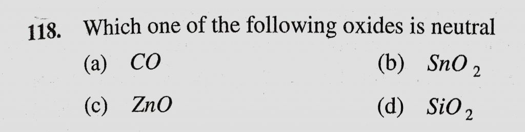 Which one of the following oxides is neutral (a) CO (b) SnO2 (c) ZnO (d) SiO2 Which one of the following oxides is neutral (a) Co (b) SnO2 (c) ZnO (d) SiO2 November 27, 2020 Category: Uncategorised (JEE Advanced Physics by BM Sharma + GMP Solutions) , Facebook Messenger WhatsApp Share this:TwitterFacebook Related