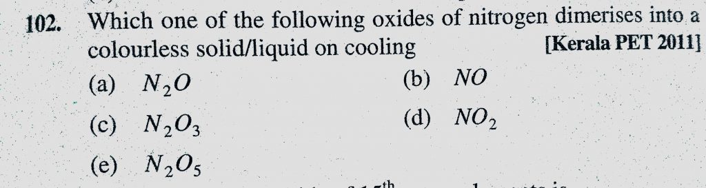 Which One of the following oxides of nitrogen dimerises into a colourless solid/liquid on cooling (a) N2O (b) NO (c) N2O3 (d) NO2 Which One of the following oxides of nitrogen dimerises into a colourless solid/liquid on cooling (a) N2O (b) NO (c) N2O3 (d) NO2 November 22, 2020 Category: Uncategorised (JEE Advanced Physics by BM Sharma + GMP Solutions) , Facebook Messenger WhatsApp Share this:TwitterFacebook Related