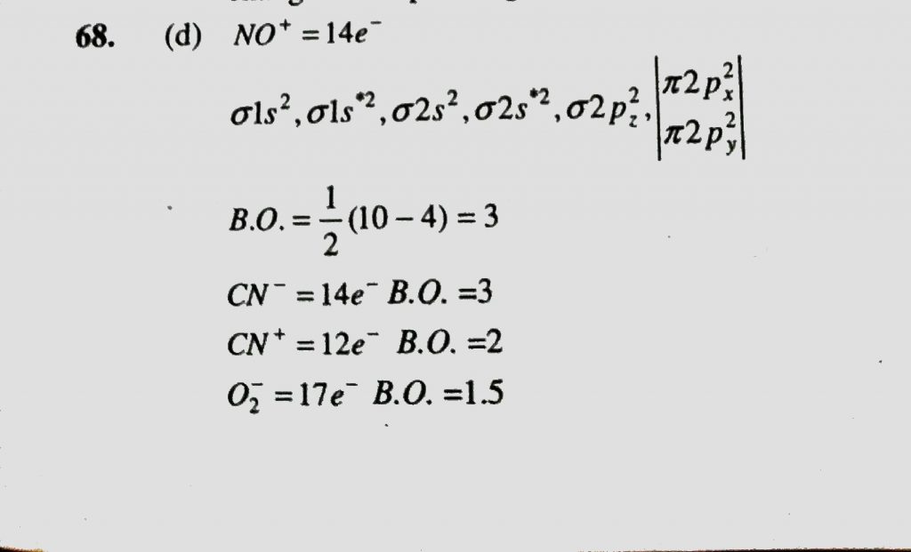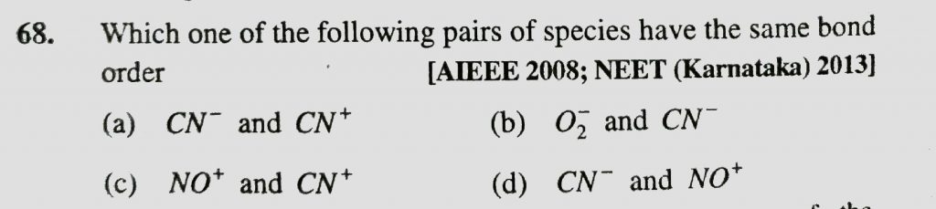 Which one of the following pairs of species have the same bond order (a) CN^- and CN^+ (b) O2^- and CN^- (c) NO^+ and CN^+ (d) CN^- and No^+ Which one of the following pairs of species have the same bond order (a) CN^- and CN^+ (b) O2^- and CN^- (c) NO^+ and CN^+ (d) CN^- and No^+ December 8, 2020 Category: Uncategorised (JEE Advanced Physics by BM Sharma + GMP Solutions) , Facebook Messenger WhatsApp Share this:TwitterFacebook Related