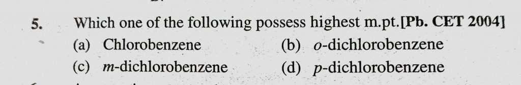 Which one of the following possess highest m.pt. (a) Chlorobenzene (b) o-dichlorobenzene (c) m-dichlorobenzene (d) p-dichlorobenzene Which one of the following possess highest m.pt. (a) Chlorobenzene (b) o-dichlorobenzene (c) m-dichlorobenzene (d) p-dichlorobenzene February 9, 2021 Category: Uncategorised (JEE Advanced Physics by BM Sharma + GMP Solutions) , Facebook Messenger WhatsApp Share this:TwitterFacebook Related