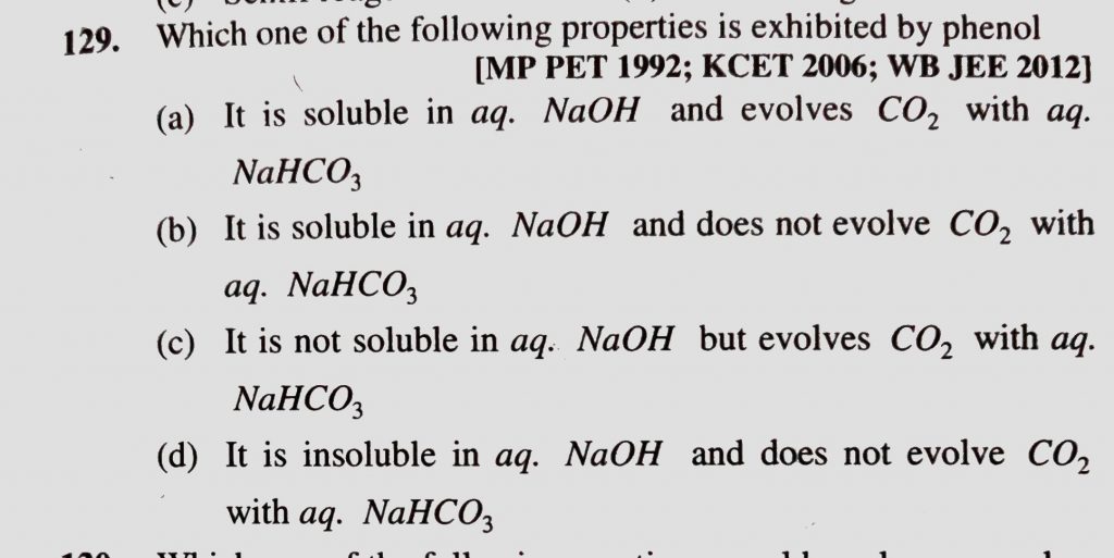 Which one of the following properties is exhibited by phenol (a) It is soluble in aq. NaOH and evolves CO2 with aq. NaHCO3 (b) It is soluble in aq. NaOH and does not evolve CO2 with aq. NaHCO3 Which one of the following properties is exhibited by phenol (a) It is soluble in aq. NaOH and evolves CO2 with aq. NaHCO3 (b) It is soluble in aq. NaOH and does not evolve CO2 with aq. NaHCO3 February 14, 2021 Category: Uncategorised (JEE Advanced Physics by BM Sharma + GMP Solutions) , Facebook Messenger WhatsApp Share this:TwitterFacebook Related