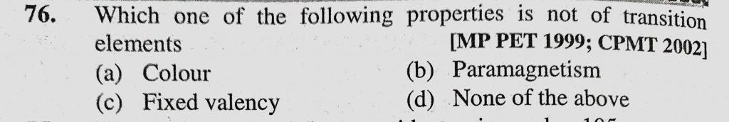 Which one of the following properties is not of transition elements (a) Colour (b) Paramagnetism (c) Fixed valency (d) None of the above Which one of the following properties is not of transition elements (a) Colour (b) Paramagnetism (c) Fixed valency (d) None of the above November 30, 2020 Category: Uncategorised (JEE Advanced Physics by BM Sharma + GMP Solutions) , Facebook Messenger WhatsApp Share this:TwitterFacebook Related