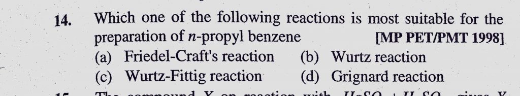 Which one of the following reactions is most suitable for the preparation of n-propyl benzene (a) Friedel-Craft’s reaction (b) Wurtz reaction (c) Wurtz-Fitting reaction Which one of the following reactions is most suitable for the preparation of n-propyl benzene (a) Friedel-Craft's reaction (b) Wurtz reaction (c) Wurtz-Fitting reaction December 15, 2020 Category: Uncategorised (JEE Advanced Physics by BM Sharma + GMP Solutions) , Facebook Messenger WhatsApp Share this:TwitterFacebook Related