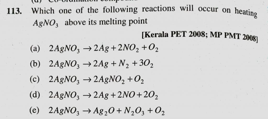 Which one of the following reactions will occur on heating AgNO3 above its melting point. Which one of the following reactions will occur on heating AgNO3 above its melting point. December 1, 2020 Category: Uncategorised (JEE Advanced Physics by BM Sharma + GMP Solutions) , Facebook Messenger WhatsApp Share this:TwitterFacebook Related