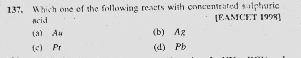 Which one of the following reacts with concentrated sulphuric acid (a) Au (b) Ag (c) Pt (d) Pb Which one of the following reacts with concentrated sulphuric acid (a) Au (b) Ag (c) Pt (d) Pb December 1, 2020 Category: Uncategorised (JEE Advanced Physics by BM Sharma + GMP Solutions) , Facebook Messenger WhatsApp Share this:TwitterFacebook Related