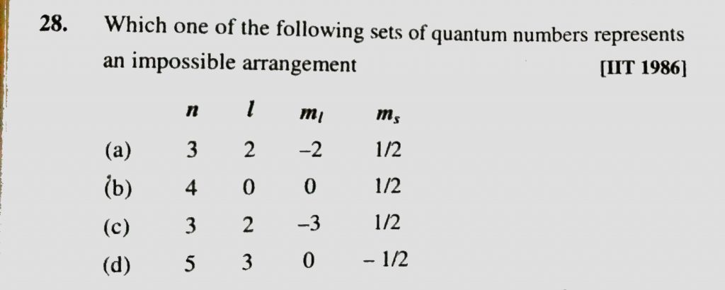 Which one of the following sets of quantum numbers represents an impossible arrangement Which one of the following sets of quantum numbers represents an impossible arrangement November 30, 2020 Category: Uncategorised (JEE Advanced Physics by BM Sharma + GMP Solutions) , Facebook Messenger WhatsApp Share this:TwitterFacebook Related