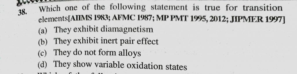 Which one of the following statement is true for transition elements (a) They exhibit diamagnetism Which one of the following statement is true for transition elements (a) They exhibit diamagnetism November 29, 2020 Category: Uncategorised (JEE Advanced Physics by BM Sharma + GMP Solutions) , Facebook Messenger WhatsApp Share this:TwitterFacebook Related