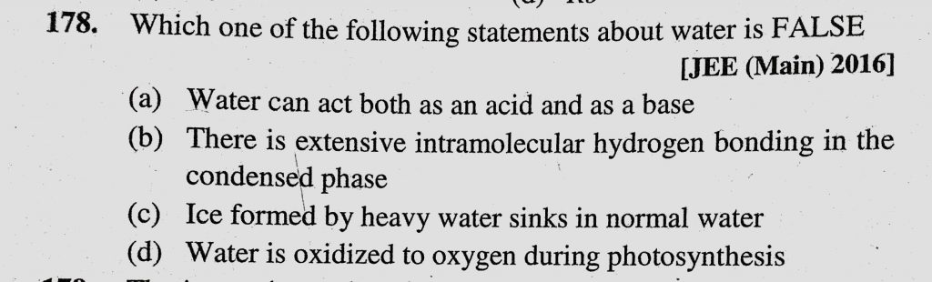 Which one of the following statements about water is FALSE (a) Water can act both as an acid and as a base (b) There is extensive intramolecular hydrogen bonding in the condensed phase Which one of the following statements about water is FALSE (a) Water can act both as an acid and as a base (b) There is extensive intramolecular hydrogen bonding in the condensed phase November 28, 2020 Category: Uncategorised (JEE Advanced Physics by BM Sharma + GMP Solutions) , Facebook Messenger WhatsApp Share this:TwitterFacebook Related