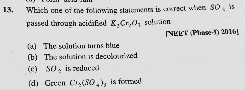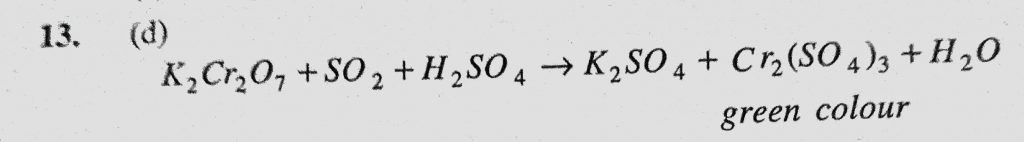 Which one of the following statements is correct when SO2 is passed through acidified K2Cr2O7 solution (a) The solution turns blue (b) The solution is decolourized Which one of the following statements is correct when SO2 is passed through acidified K2Cr2O7 solution (a) The solution turns blue (b) The solution is decolourized November 23, 2020 Category: Uncategorised (JEE Advanced Physics by BM Sharma + GMP Solutions) , Facebook Messenger WhatsApp Share this:TwitterFacebook Related