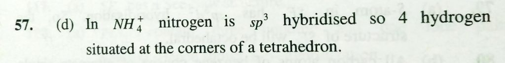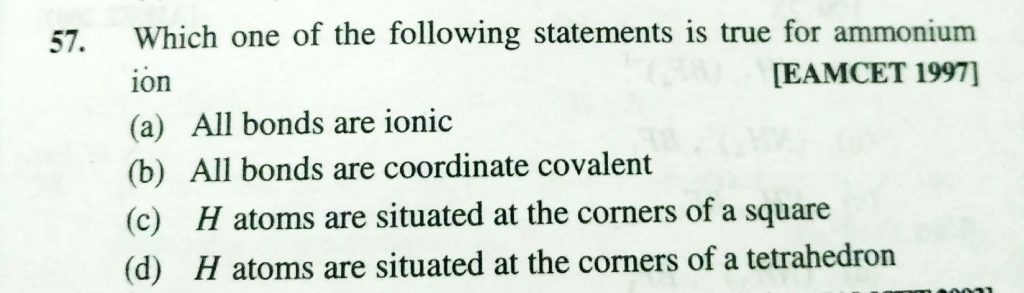 Which one of the following statements is true for ammonium ion (a) all bonds are ionic (b) all bonds are coordinate covalent (c) H atom are situated at the corners of a square (d) H atom are situated at the corners of a tetrahedron among the following is The incorrectly matched pair December 6, 2020 Category: Uncategorised (JEE Advanced Physics by BM Sharma + GMP Solutions) , Facebook Messenger WhatsApp Share this:TwitterFacebook Related