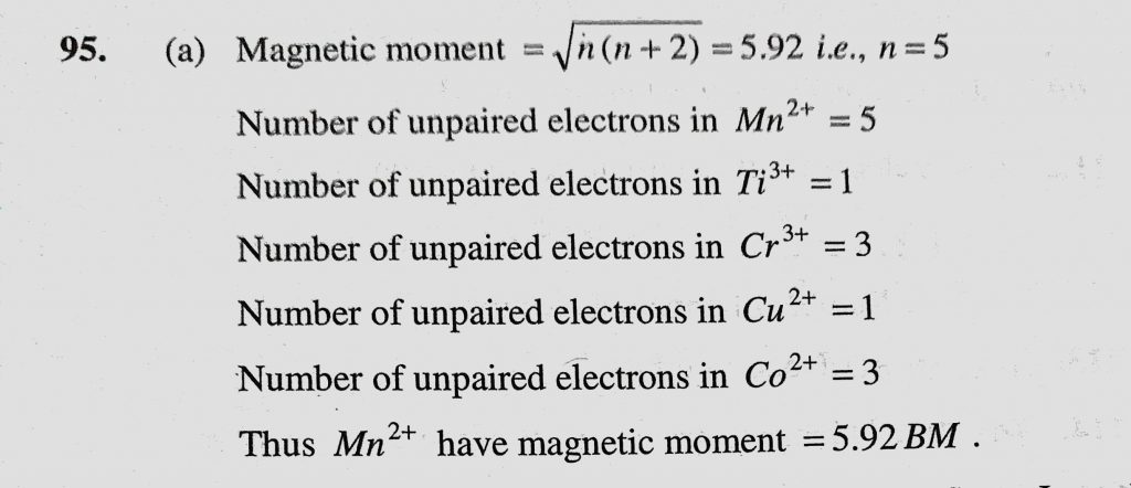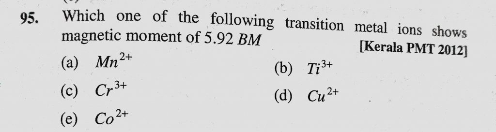 Which one of the following transition metal ions shows magnetic moment of 5.92 BM (a) Mn 2+ (b) Ti 3+ (c) Cr 3+ (d) Cu 2+ Which one of the following transition metal ions shows magnetic moment of 5.92 BM (a) Mn 2+ (b) Ti 3+ (c) Cr 3+ (d) Cu 2+ November 30, 2020 Category: Uncategorised (JEE Advanced Physics by BM Sharma + GMP Solutions) , Facebook Messenger WhatsApp Share this:TwitterFacebook Related