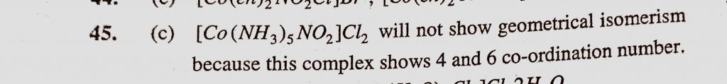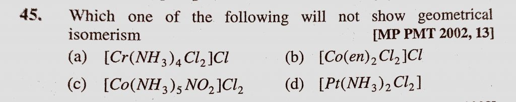 Which one of the following will not show geometrical isomerism (a) (Cr(NH3)4Cl2)Cl (b) (Co(en)2Cl2)Cl Which one of the following will not show geometrical isomerism (a) (Cr(NH3)4Cl2)Cl (b) (Co(en)2Cl2)Cl December 4, 2020 Category: Uncategorised (JEE Advanced Physics by BM Sharma + GMP Solutions) , Facebook Messenger WhatsApp Share this:TwitterFacebook Related