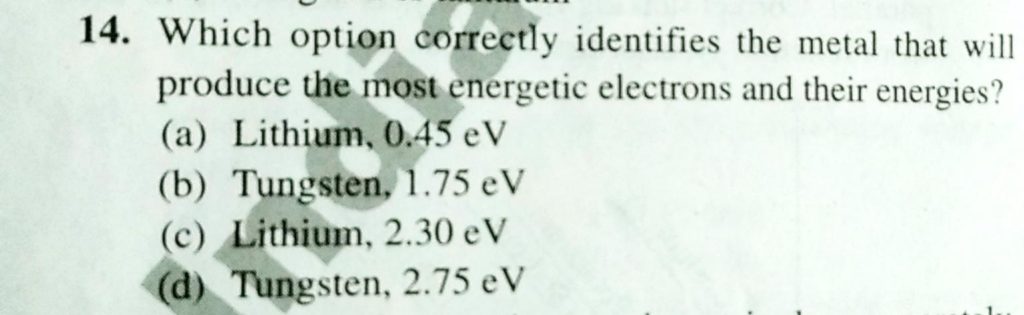 Which option correctly identifies the metal that will produce the most energetic electrons and their energies? Which option correctly identifies the metal that will produce the most energetic electrons and their energies? September 13, 2020 Category: Uncategorised (JEE Advanced Physics by BM Sharma + GMP Solutions) , Facebook Messenger WhatsApp Share this:TwitterFacebook Related