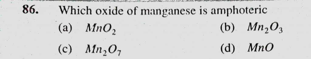 Which oxide of manganese is amphoteric (a) MnO2 (b) Mn2O3 (c) Mn2O7 (d) MnO Which oxide of manganese is amphoteric (a) MnO2 (b) Mn2O3 (c) Mn2O7 (d) MnO December 1, 2020 Category: Uncategorised (JEE Advanced Physics by BM Sharma + GMP Solutions) , Facebook Messenger WhatsApp Share this:TwitterFacebook Related