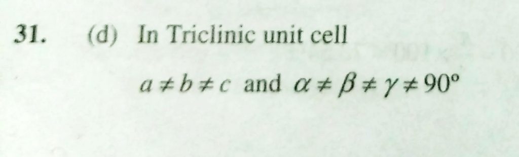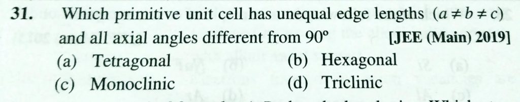 \Which primitive unit cell has unequal edge lengths (a is not equal yto b is noit equal to c ) and all axial angles different from 90 degree (a) Tetrahedral (b) Hexagonal (c) Monoclinic (d) Triclinic \Which primitive unit cell has unequal edge lengths (a is not equal yto b is noit equal to c ) and all axial angles different from 90 degree (a) Tetrahedral (b) Hexagonal (c) Monoclinic (d) Triclinic February 9, 2021 Category: Uncategorised (JEE Advanced Physics by BM Sharma + GMP Solutions) , Facebook Messenger WhatsApp Share this:TwitterFacebook Related
