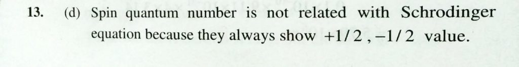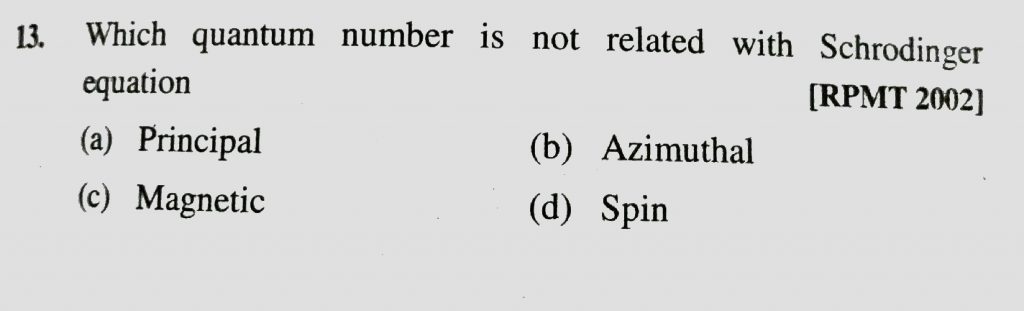 Which quantum number is not related with Schrodinger equation (a) Principal (b) Azimuthal (c) Magnetic (d) Spin Which quantum number is not related with Schrodinger equation (a) Principal (b) Azimuthal (c) Magnetic (d) Spin November 28, 2020 Category: Uncategorised (JEE Advanced Physics by BM Sharma + GMP Solutions) , Facebook Messenger WhatsApp Share this:TwitterFacebook Related